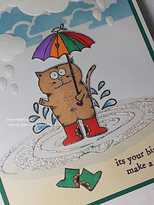I love this card Steph, the cat is super-cute and the background is a perfect setting. I'm not sure that brolly is very effective though, it's a trifle small. No wonder your soggy moggy looks a little perturbed 😁 💕 Clare x